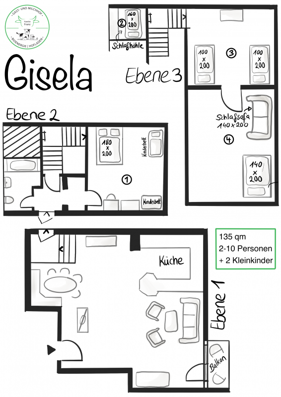 1 Schlafzimmer mit Doppelbett und 2 Kinderbetten, 1 Schlafzimmer mit 2 Einzelbetten, 1 Schlafnische mit Doppelbett (über einer Leiter erreichbar), großer Wohn-, Koch- und Essbereich. In der Gisela gibt es die Möglichkeit, ein zusätzliches Zimmer mitzubuchen, dass sich ans obere Schlafzimmer anschließt. Dort gibt es ein Doppelbett (140 cm) und eine Schlafcouch.