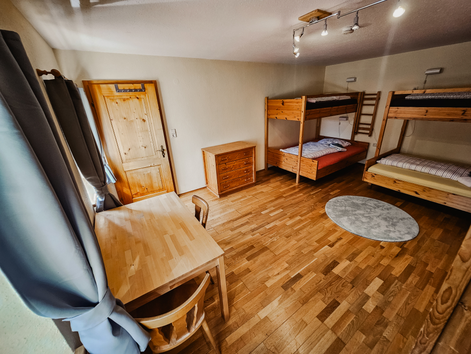 1 Schlafzimmer mit großem Doppelbett, 1 Schlafzimmer mit zwei Doppelstockbetten (untere Liegefläche 1,40 m), 1 großer Wohn-, Essbereich mit offener Küche.